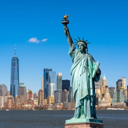 La statue est construite en France entre 1875 et 1884, avec l’aide de l’ingénieur Gustave Eiffel pour la structure interne. Elle est ensuite démontée, expédiée par bateau, et réassemblée sur l’île de Bedloe (aujourd’hui Liberty Island) dans le port de New York. L’inauguration a lieu le 28 octobre 1886.