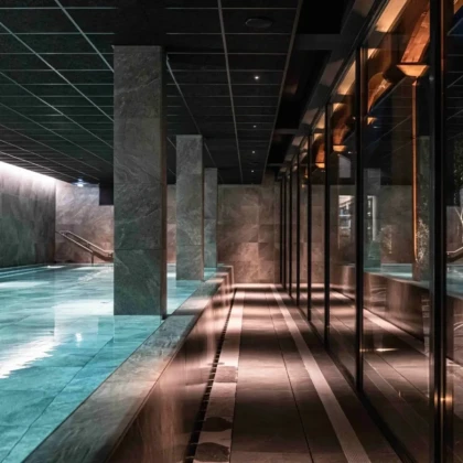 Vous aurez le choix entre 330m² de bains et labyrinthe intérieur comme extérieur, un hammam, quatre univers de repos, une snow case, sept suites de massages, une salle de fitness et une boxing corner.
